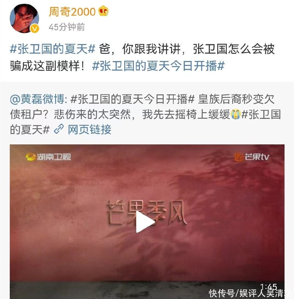 看点:由刘闯执导,黄磊、刘奕君、海清、梅婷等主演,李林谦联合主演,韩童生、苏小明特别出演的电视剧《张卫国的夏天》,在湖南卫视开播了。