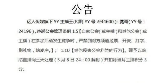 亿人传媒旗下主播王小源(YY号:944600);冕哥(YY号:24196),违反公会管理条例1.5【自家公会(或主播)和其他公会(或主播)在参加活动发生竞争时,严禁到对方频道拉黑、开麦、打字、刷礼物、站麦序。