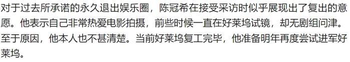 陈冠希的这番表态让人不禁回想起他当年因不雅照风波而备受打击的日子。那时,他的形象一落千丈,名誉受损严重。现如今,他似乎已经走出了阴影,重新开始了自己的事业。尽管在好莱坞试镜时遭遇了挫折,但他并未放弃追求自己的演艺梦想,依旧在演艺事业的道路上不断前行。