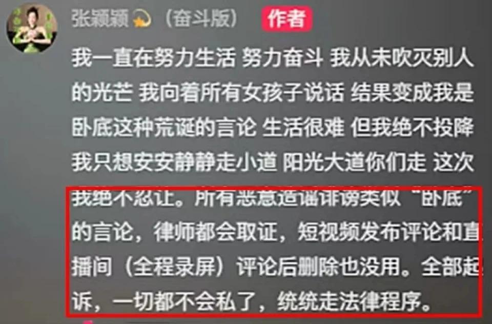 张颖颖发声了,表示自己一直努力生活,努力奋斗,从未吹灭别人的光芒,向着所有女孩子说话,结果变成自己是卧底这种荒诞的言论。生活很难,但自己绝不投降,自己只是想安安静静走小道,阳光大道你们走,这次绝不忍让。所有恶意造谣诽谤类似 " 卧底 " 的言论,律师都会取证,短视频发布评论和直播间(全程录屏)评论后删除也没用。全部起诉,一切都不会私了,统统走法律程序。