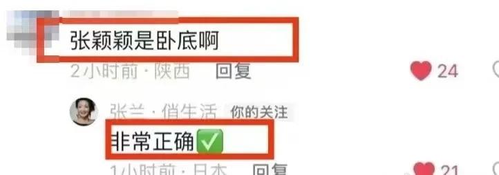 张兰的账号回复网友质疑,认为张颖颖是前妻派来的卧底,张兰账号给予肯定。