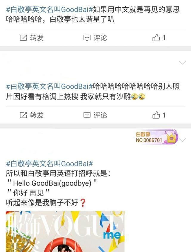 粉丝们表示Good Bai这英文名是小白能想出来的名,做出来的事,并且这英文名如此接地气,打算以后就叫他好白了!哈哈,小白的粉丝和林更新的粉丝差不多,都是和自己爱豆相爱相杀的类型。