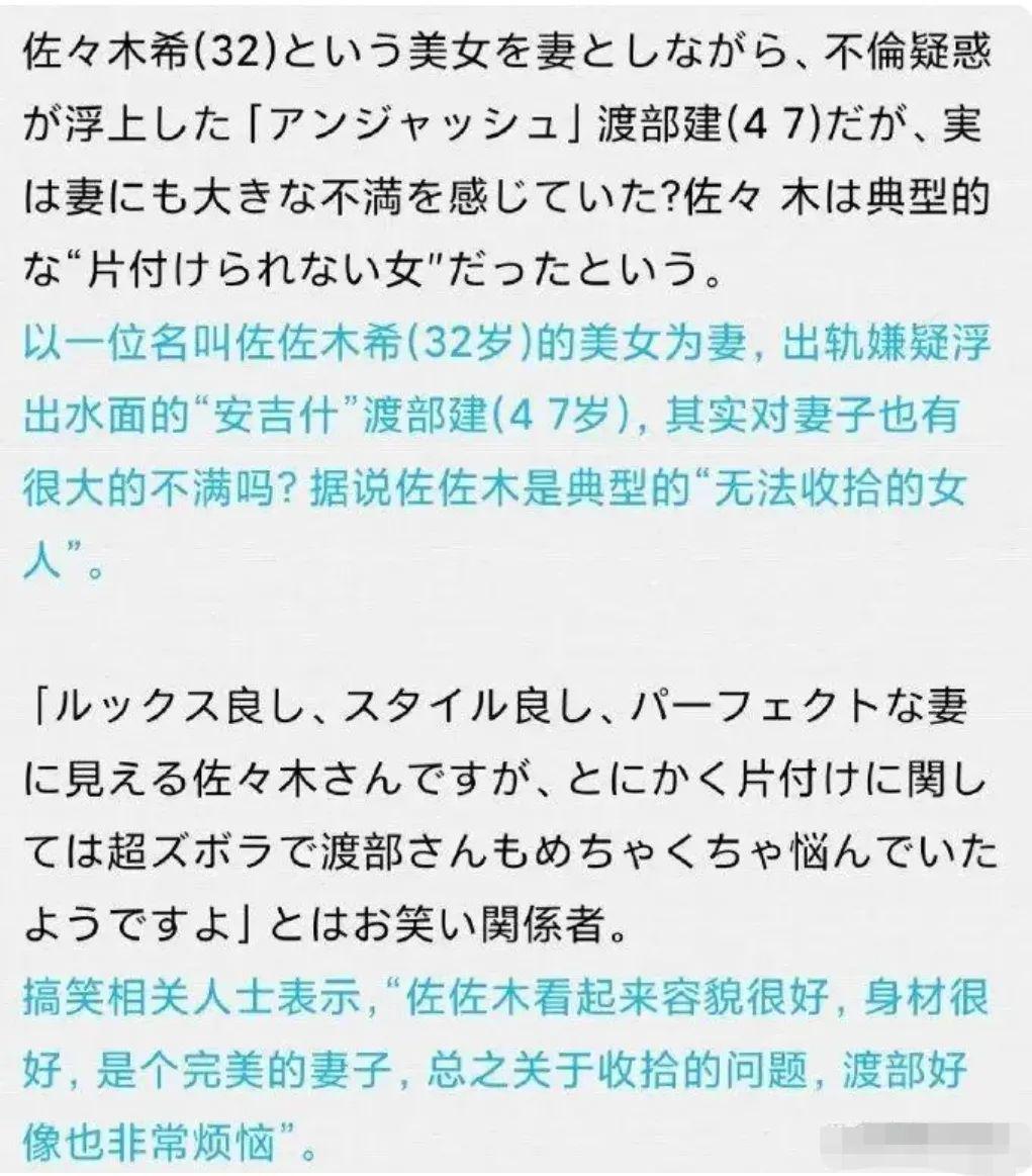 更有相关人士透露他出轨的理由是 " 渡部建是洁癖,受不了佐佐木希把家里弄得乱糟糟的 "?!