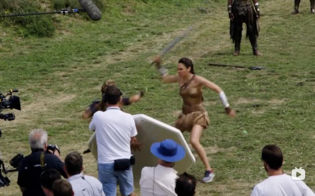 演员加朵在片场穿着运动鞋打斗,银幕上,却是神奇女侠穿着高跟长靴大杀四方。