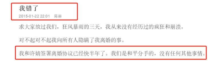 陈赫发表了一篇名为“我错了”的长文,自己和许婧已经与半年前协议离婚。