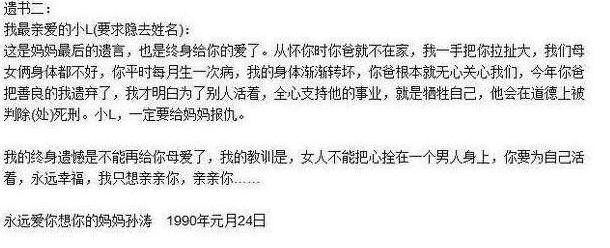 她还拿出了女儿的遗书。遗书上全都是孙涛对唐国强的怨恨,甚至还要女儿为她报仇。