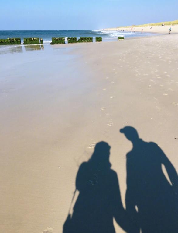 其中,最有爱的一张照片就是他们在沙滩上的影子合影,紧紧牵着彼此的手,这种小情侣之间的把戏,放在一对中年夫妻身上,显得格外有情调。