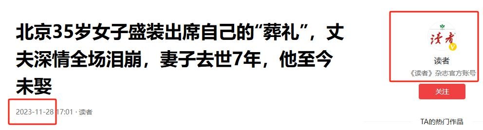 2.读者-2023.11.28-《北京35岁女子盛装出席自己的“葬礼”,丈夫深情全场泪崩,妻子去世7年,他至今未娶》