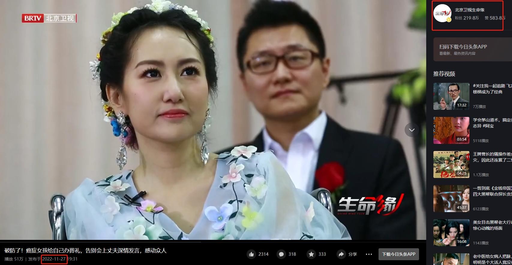 1.北京卫视生命缘-2022.11.27-《破防了!癌症女孩给自己办葬礼,告别会上丈夫深情发言,感动众人》