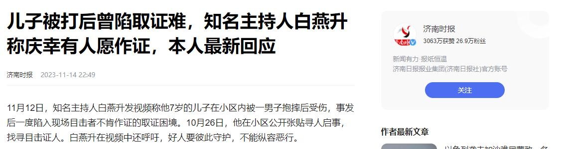 济南时报2023年11月14日——儿子被打后曾陷取证难,知名主持人白燕升称庆幸有人愿作证,本人最新回应