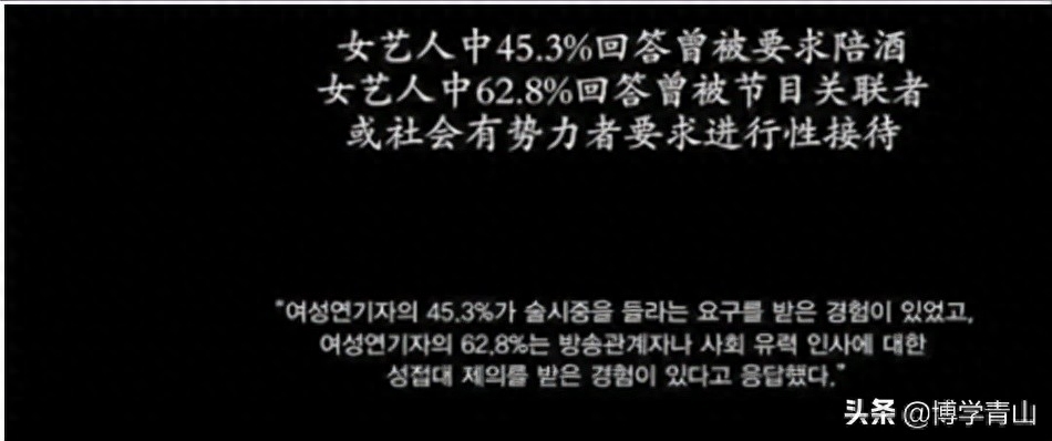 据相关统计,韩国45.3%的女艺人被要求陪酒,62.8%的女艺人被要求进行性接待。