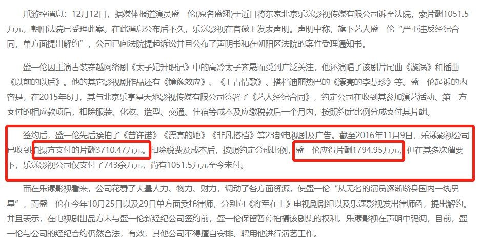 2016年11月,曾经凭借《太子妃升职记》爆火的盛一伦,跟公司打起了官司,主要诉求是公司不发片酬,也正式这次关系让群众知晓了演员的片酬。