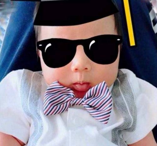 胡杏儿在微博晒出一张儿子的照片,并配文:“满月当然要穿西装庆祝一下”。照片中的Brendan身穿小西装,戴着“学士帽”,黑超遮面,肉嘟嘟的小胳膊,尽显萌态。