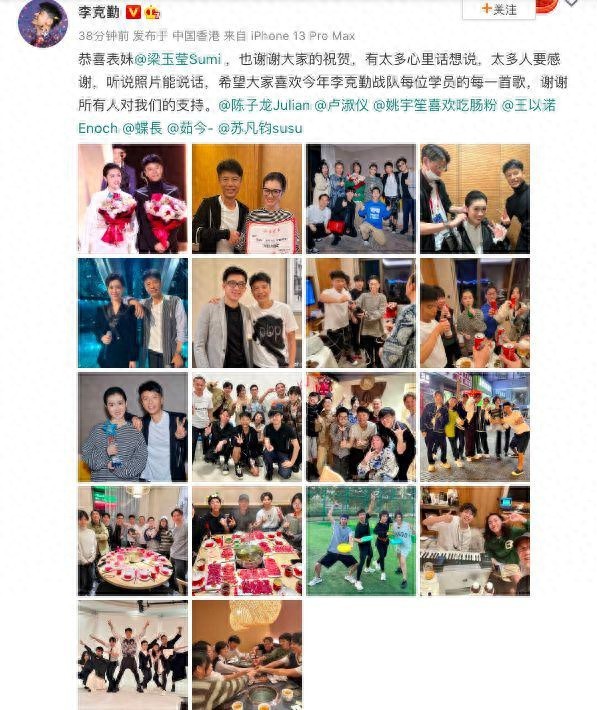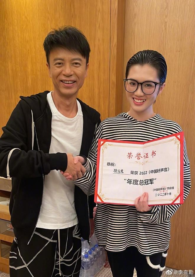 29 日,李克勤晒出大合照庆祝梁玉莹夺《2022 中国好声音》冠军,他发文称:" 恭喜表妹梁玉莹,也谢谢大家的祝贺,有太多心里话想说,太多人要感谢,听说照片能说话,希望大家喜欢今年李克勤战队每位学员的每一首歌,谢谢所有人对我们的支持。"