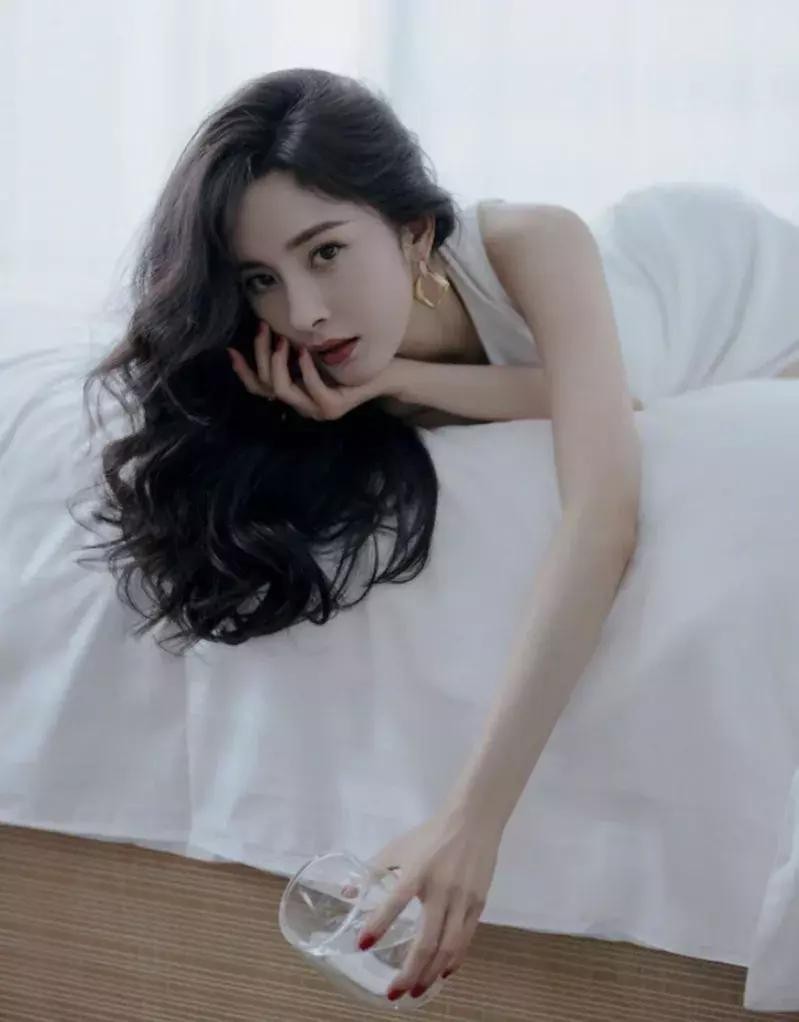 杨幂晒最新写真照片,一头大波浪卷发俯卧床上,备显慵懒。