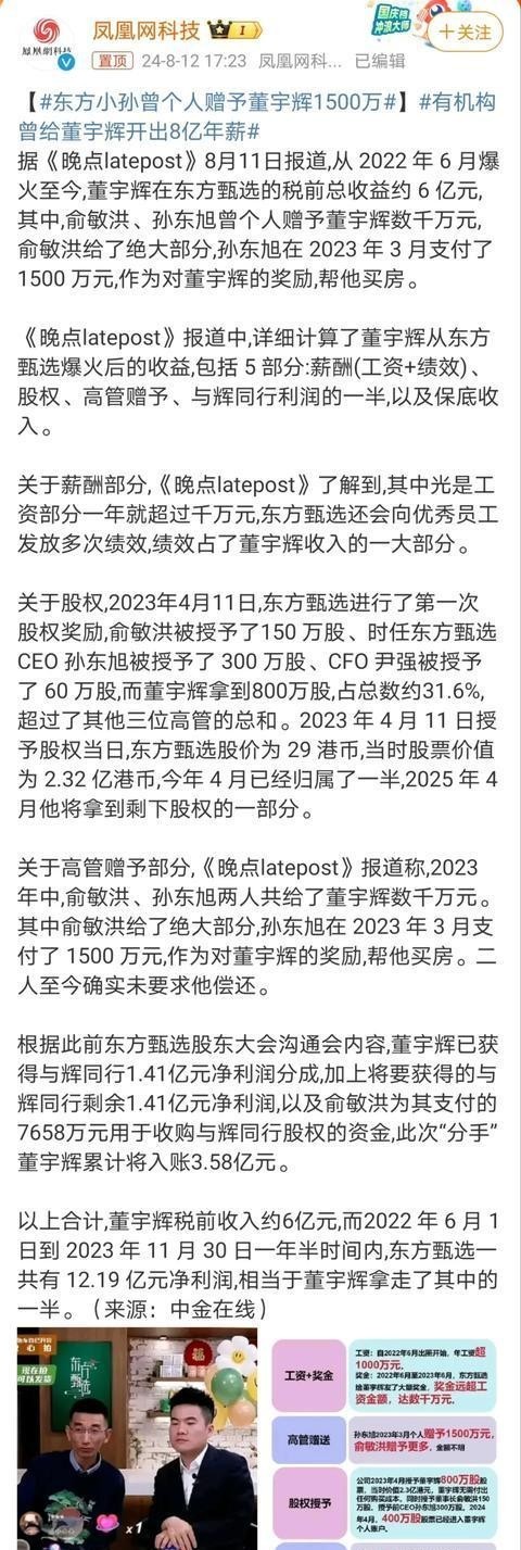 东方小孙曾赠予董宇辉1500万!此间收入或达6亿!难怪都想当网红