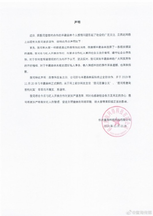 11月22日,杭州蜜淘网络科技有限公司官方微博发布声明称,自(阿沁刘阳分手 刘阳出轨半藏森林)事件发生之日,公司即与半藏森林实际终止全部合作,并于2019年11月20日与半藏森林正式解约。