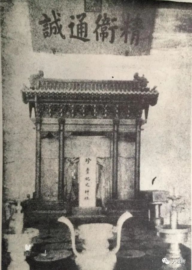 屋内还有一块匾写着四个大字“精卫通诚”,下面有一个小神龛,龛内有一牌位上面写着“珍贵妃之神位”。