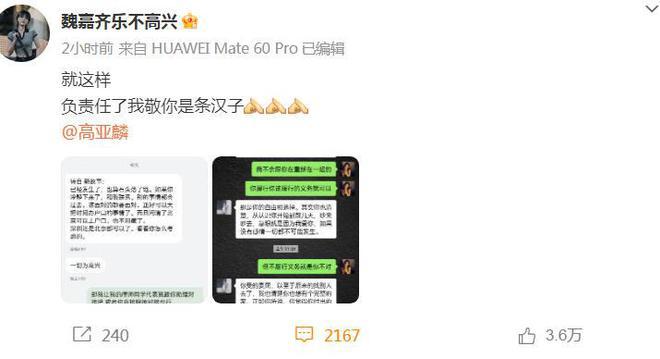 5 月 10 日,魏嘉再一次更新动态,她晒出和高亚麟的短信聊天,算是高亚麟对此事做出回应了。