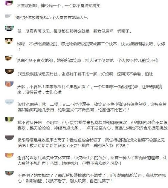 极限挑战的观众说得最多的是谢娜会拉低节目的档次。这部分观众认为,谢娜在快本舞台上习惯装疯卖傻,不适合极限挑战,跟节目风格不一致,极限男人帮玩的是幽默,而谢娜没有营养的搞笑,肯定会让节目变得十分尴尬。