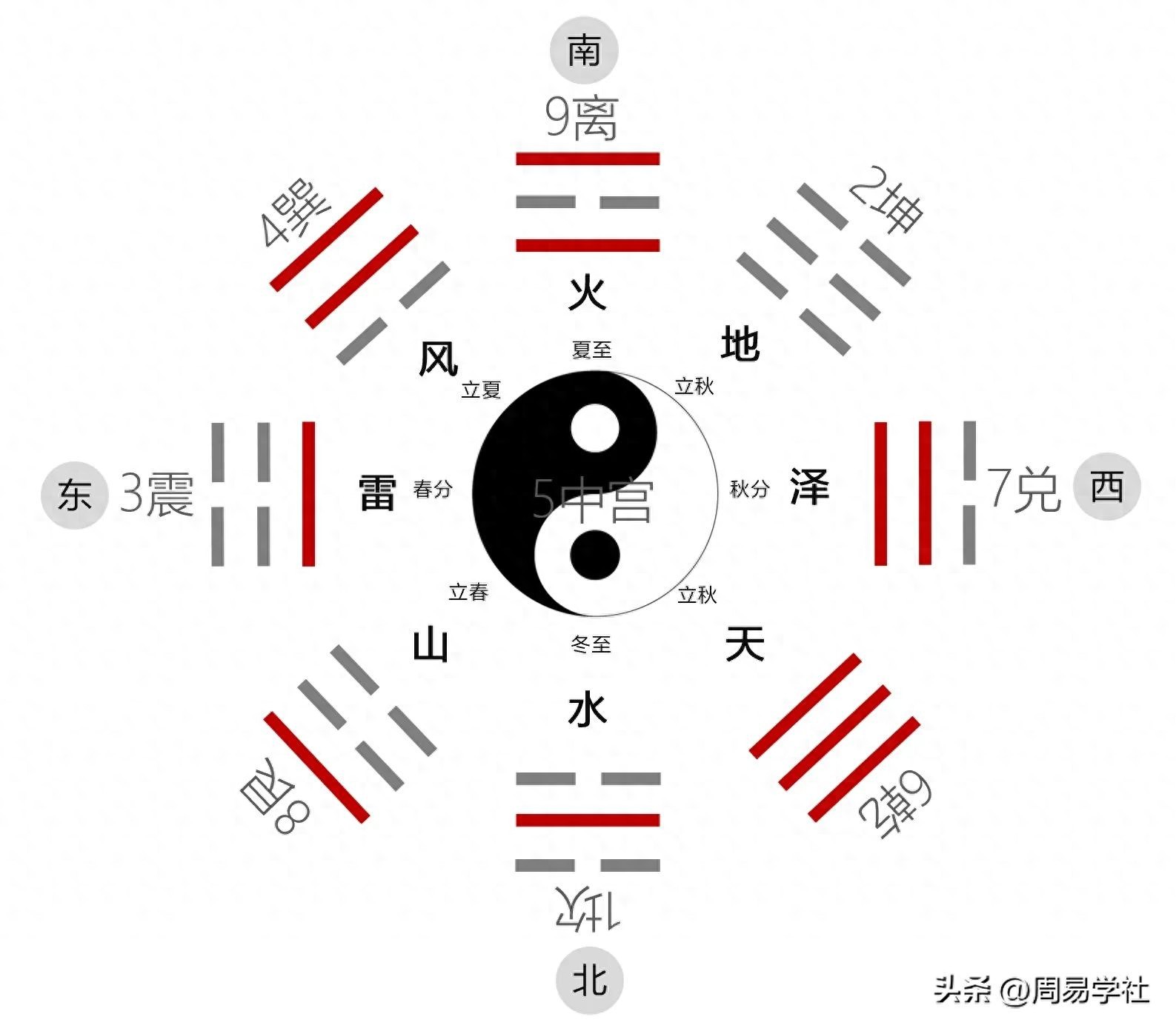 3、后天八卦数:坎一、坤二、震三、巽四、五中宫、 乾六、七兑、八艮、离九。