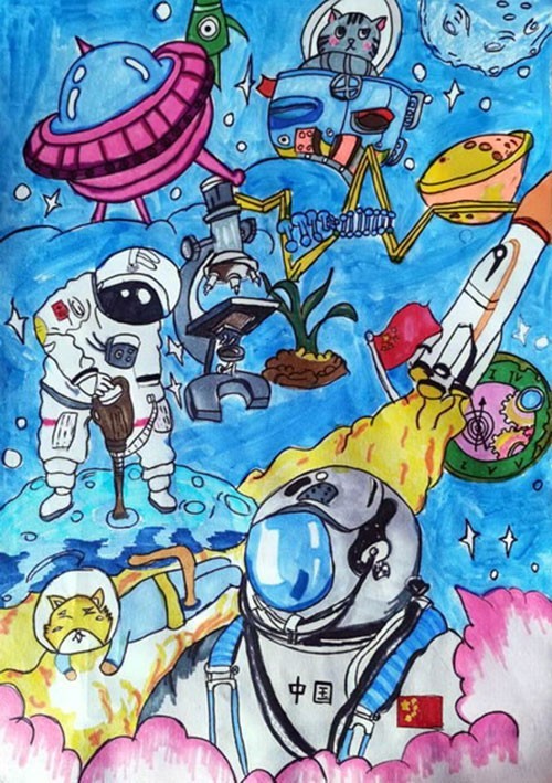 点评:小作者画风随意,就像说话一样,彰显出了独特的个性和随心所欲创作的灵感。小小年纪能把虚幻的太空之旅,用生动形象的绘画手法表达出来,实属不易。