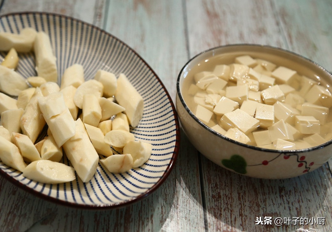 5、山药去皮切成小块,豆腐切成块加入适量开水和少许盐泡着备用。
