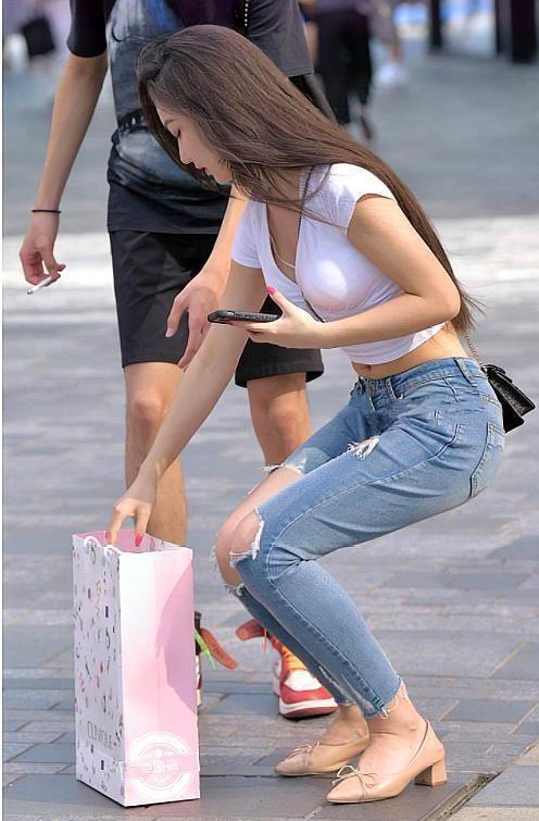 这位小姐姐身穿白色上衣,搭配破洞牛仔裤,简约时尚。