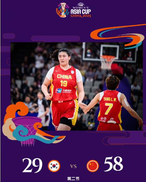 次节开局,韩旭送出大帽与内线得分,朴智秀中投追分,罗欣棫连得 5 分扩大 22 分优势。韩国女篮一波 6-2 攻势追分,韩旭与张子宇接连得分,贾赛琪与杨力维也是相继命中三分,中国女篮继续扩大 52-25 领先优势。韩国女篮冲击内线追分,王思雨连得 4 分,中国女篮单节 27-15 再赢 12 分,上半场结束中国女篮 58-29 领先韩国女篮。前两节比赛,中国女篮三分 10 中 7,韩国女篮三分仅 10 中 1,外线净胜 6 记三分多达 18 分,罗欣棫 13 分、杨力维 10 分与王思雨 11 分 5 助攻。