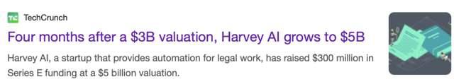 泓君:其实我看到今年上半年除了coding的公司,还是有非常多的AI Agent公司拿到了大笔融资的,比如说Harvey AI,是一个做法律咨询的AI Agent,他们也是在2025年的6月份拿到了自己F轮的3亿美元融资,现在也估值50亿美元了。