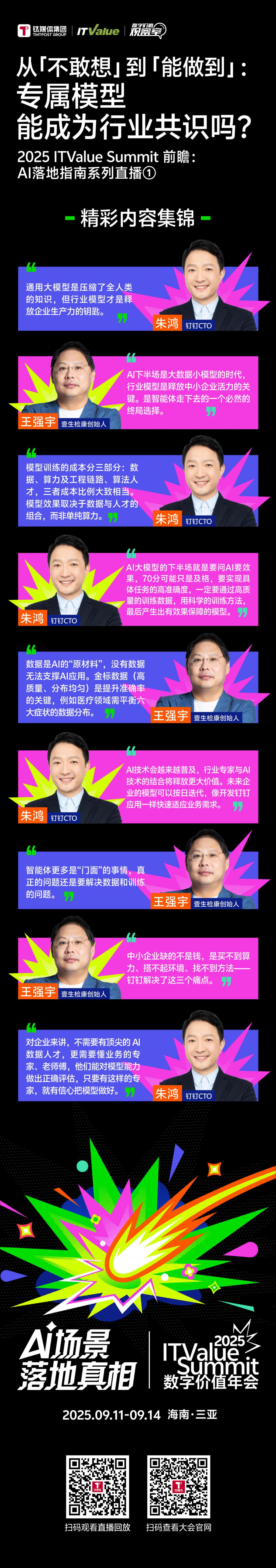 在钛媒体2025 ITValue Summit前瞻之AI落地指南系列的首场直播中,钉钉CTO朱鸿、壹生检康创始人王强宇与钛媒体联合创始人刘湘明的对话,核心命题直指AI落地的本质:专属模型能否成为行业共识?