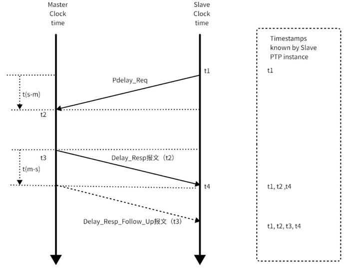 Pdelay_Resp:Responder 接收 Pdelay_Req 报文并标记该报文到达时刻的时间戳 t2,随后 Responder 发送 Pdelay_Resp 报文并标记该报文发出时刻的时间戳 t3,Pdelay_Resp 报文携带时间信息 t2,Requester 接收 Pdelay_Resp 报文并标记该报文到达时刻的时间戳 t4。