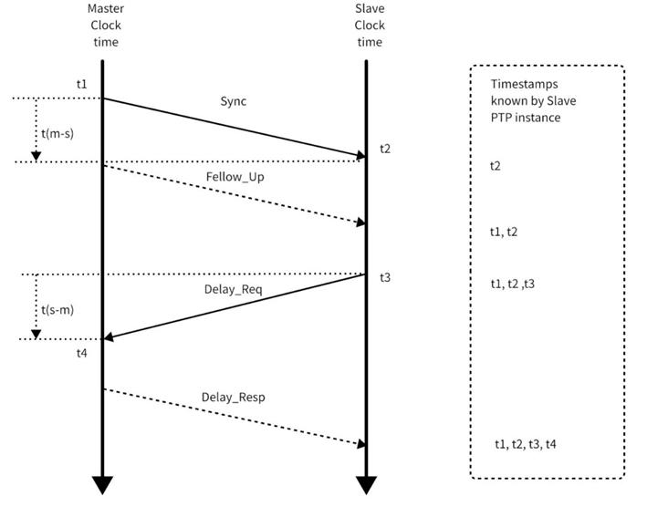 PTP 时间同步流程 Sync:主时钟发送同步报文,记录发送时间 t1。Follow_Up:主时钟补发 t1,从时钟接收后计算 t1 + Delay + Δ = t2。Delay_Req:从时钟发送延迟请求,记录发送时间 t3。Delay_Resp:主时钟补发 t4,从时钟计算 t3 + Delay - Δ = t4。