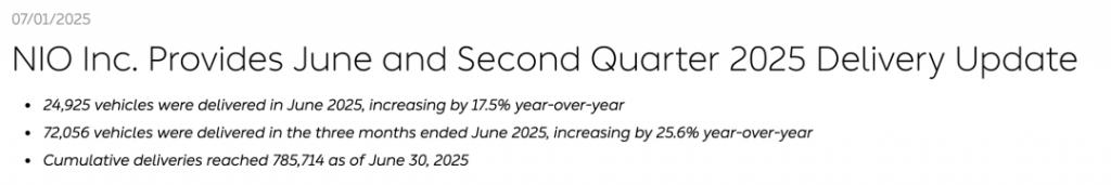 蔚来汽车 2025 年第二季度的车辆交付情况 / 图源:NIO 官网