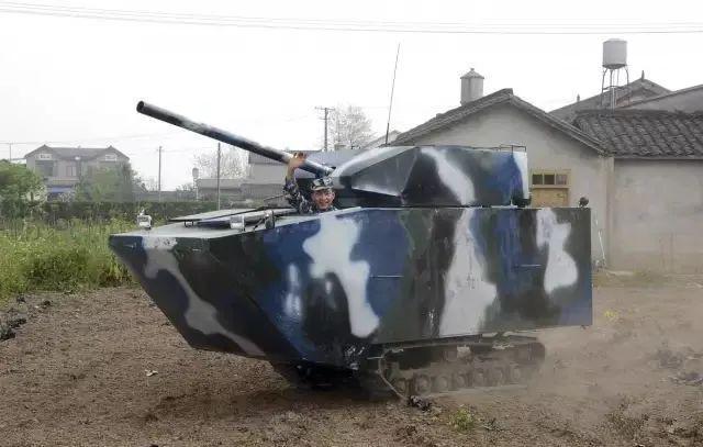 绵竹市孝德镇茶店子村农民简林曾经在海军服役,退伍后在 2014 年花了 4 万元,为自己 6 岁的儿子造了一辆长 4.5 米宽 1.6 米高 2.1 米,总重接近 3 吨 " 水陆两栖坦克 ",并且涂上了 " 海洋迷彩 "。