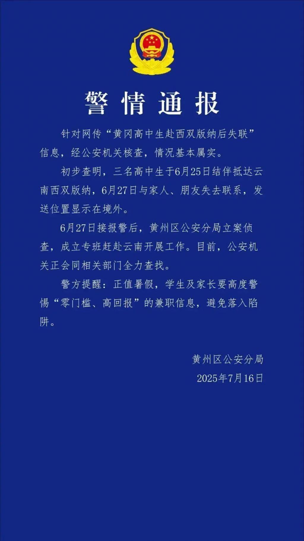 针对网传 " 黄冈高中生赴西双版纳后失联 " 信息,经公安机关核查,情况基本属实。