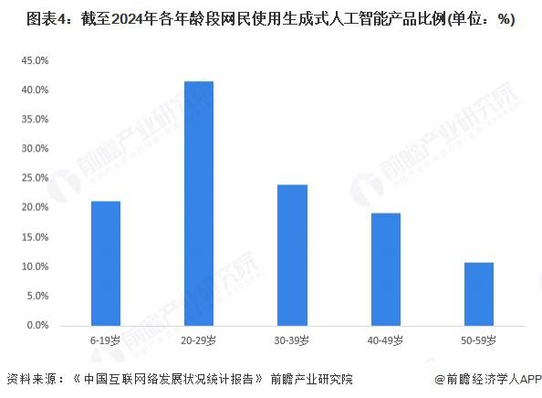 截至 2024 年 12 月,我国有 3.31 亿人表示自己听说过生成式人工智能产品,占整体人口的 23.5%。从各年龄段网民的使用情况来看,20-29 岁网民使用生成式人工智能产品的比例最高,达到 41.5%; 其次为 30-39 岁网民,比例为 23.9%;6-19 岁网民也达到 21.1%。通过对使用过生成式人工智能产品的用户进一步调查发现,利