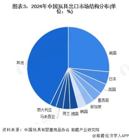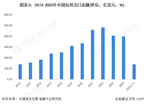 2014-2022 年期间,我国玩具出口金额呈现出稳步攀升的态势,这一增长趋势反映了我国玩具产业在全球市场上的强劲竞争力以及海外消费者对 " 中国制造 " 玩具产品的持续青睐。然而,自 2023 年起,玩具出口金额的增长势头有所放缓,出现了下降的情况。这种变化主要是受全球经济恢复不如预期、地缘冲突、贸易保护主义抬头等客观因素影响,同时美国作为我国玩具市场第一大出口国在对等关税政策下,出口压力持续增加。