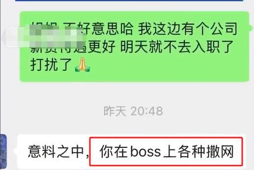 据湖北广电经视直播消息,上述公司的 HR 却表示:" 意料之中,你在 boss 上各种撒网,没有契约精神,没有诚信,我们业内会广而告之你这样的。" 经视直播记者尝试联系当事人,但未获回应。