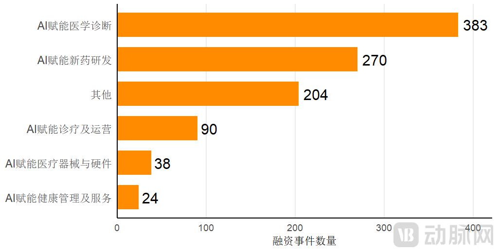 近10年来,国内AI医疗项目在细分赛道上出现明显结构性分化。AI赋能医学诊断以383起融资事件高居首位,成为资本最为青睐的领域,反映出AI在医学影像与辅助诊断领域的快速落地和商业化预期突出。AI赋能新药研发以270起融资位列第二,显示出AI在药物发现及分子设计环节技术前景备受资本认可。相较而言,其他类别(204起)、AI赋能诊疗及运营(90起)、医疗器械与硬件(38起)、健康管理及服务(24起)则显著落后,表明行业资源和投资主要集中在医学诊断和新药研发两个核心赛道。
