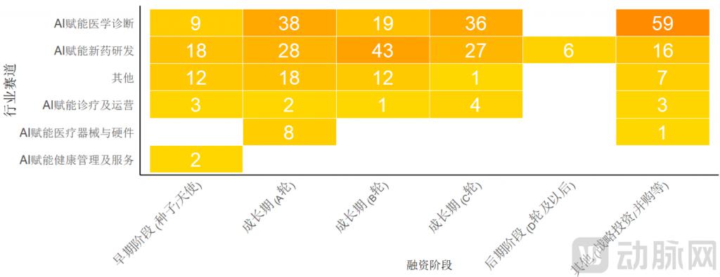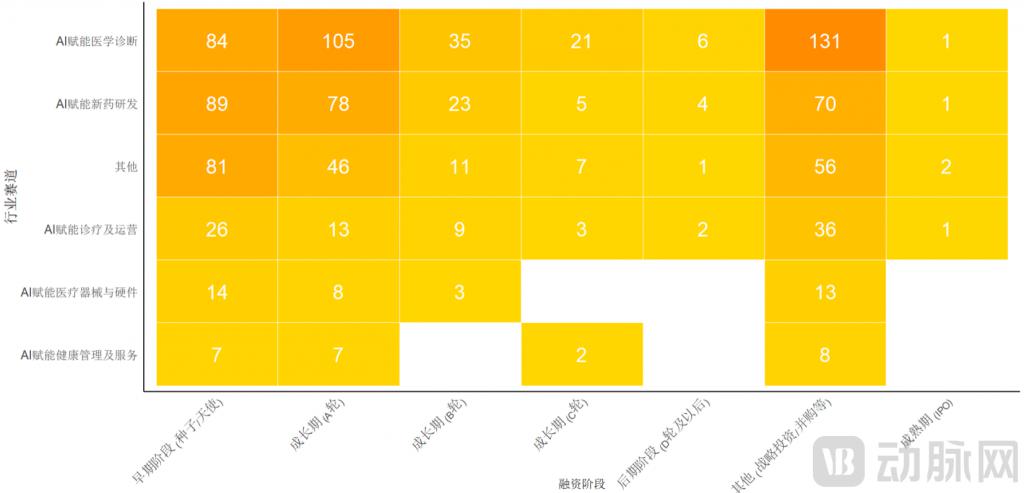 值得关注的是,在超后期的pre-IPO及并购阶段,AI医学诊断和新药研发赛道分别获得了131起和70起融资事件,远超其他赛道,说明资本和资源高度向行业成熟龙头企业聚集;与之形成鲜明对比的是,诊疗及运营、医疗器械与硬件、健康管理与服务等赛道无论在各轮次项目数还是后期资本关注度上均远低于前述两大核心赛道,资本关注呈现高度集中化趋势。
