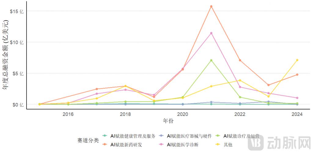在融资金额层面,整体趋势与项目数量保持高度一致。2021年,国内AI新药研发赛道年度融资总额首次超过15亿美元,AI医学诊断赛道也达到10亿美元的历史高点。然而,2022年以后,受行业调整和宏观经济环境影响,核心赛道的融资金额大幅回落,降至高峰期的三分之一以下。值得注意的是,AI赋能诊疗及运营赛道在2021年也实现了一次融资金额的小高峰,但整体规模依然远低于前述两大赛道。其他赛道如健康管理及服务、医疗器械与硬件在近十年中融资金额始终处于较低水平,尚未迎来显著突破。