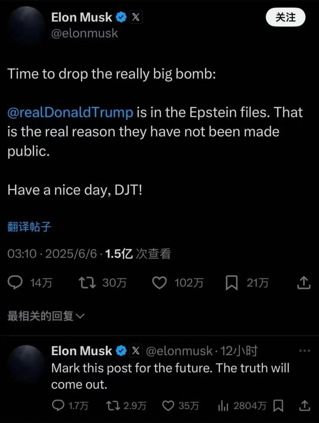 6 月初,他和特朗普对骂,郑重其事地大喊:" 是时候放重磅炸弹了:特朗普在爱泼斯坦文件中 "。但随后又灰不溜秋删了推文。