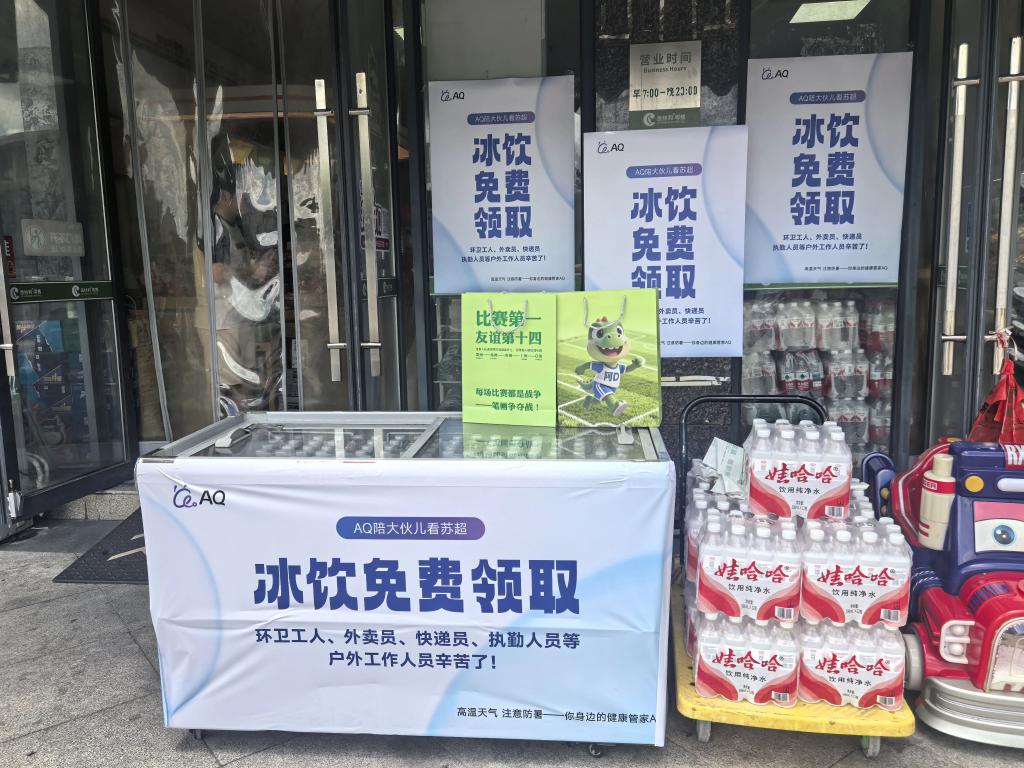 新北区三井街道的街角,金丝利零售店的 90 后夫妻小秦和小许,早就在超市前支起了爱心冰柜。他们和 AQ 项目合作,专为户外工作者和远道而来的球迷免费提供冷饮、防暑贴士,冰柜外 " 冰饮免费 " 的标志在阳光下格外醒目。
