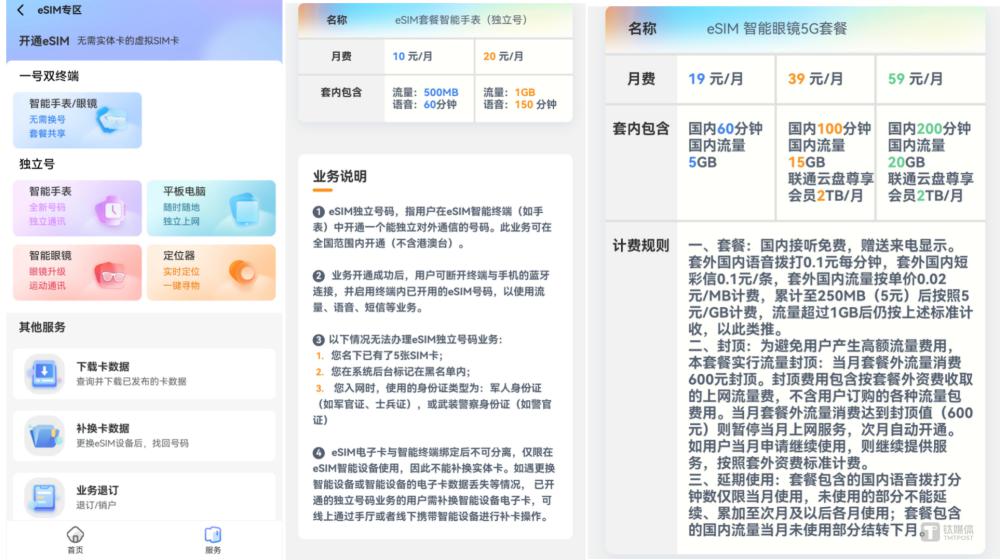 对比下,联通的 eSIM 业务相对选择的要多。除了手表之外,联通 eSIM 还支持智能眼镜、平板等设备,并给出了一号双终端和独立号的选项,背后的套餐资费也不相同。一号双终端一个号码仅支持绑定一个智能终端,手表眼镜二选一,要求手机与附属设备只能在同一地区使用,资费在 10 元,相当于开了副卡,但附属设备不支持短信和国际漫游业务,支持 3G 和 4G,暂不支持 5G 数据业务。