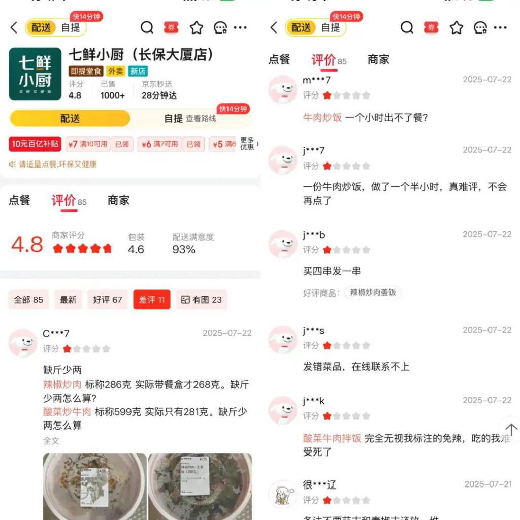 诚如陈哥所言,实际上,《听筒 Tech》发现,仅仅上线两天时间,七鲜小厨便产生了不少差评,吐槽点集中在 " 卡餐、时间长、服务跟不上 " 等问题上。