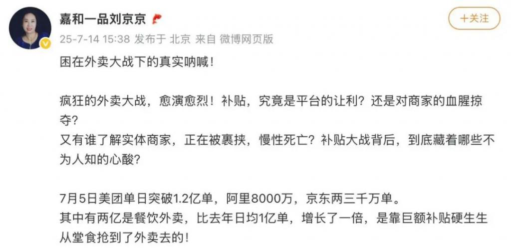 前段时间,嘉和一品创始人兼董事长刘京京,更在社交媒体发文控诉外卖大战裹挟商家。她表示如果顾客使用了一个 10 元红包,平台只出 3 元,商家要补 7 元,大头都是商家出的,所谓的外卖大战其实是对餐饮商家的掠夺。