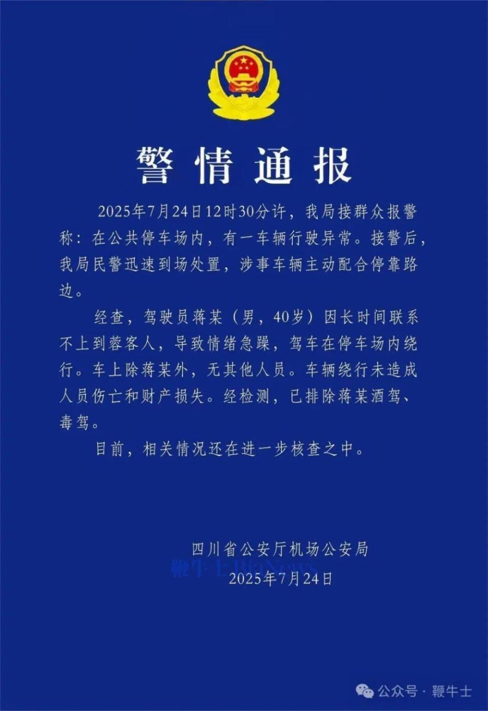 警方称,经查,驾驶员蒋某 ( 男,40 岁 ) 因长时间联系不上到客人,导致情绪急躁,驾车在停车场内绕行。车上除蒋某外,无其他人员。车辆绕行未造成人员伤亡和财产损失。经检测,已排除蒋某酒驾、毒驾。