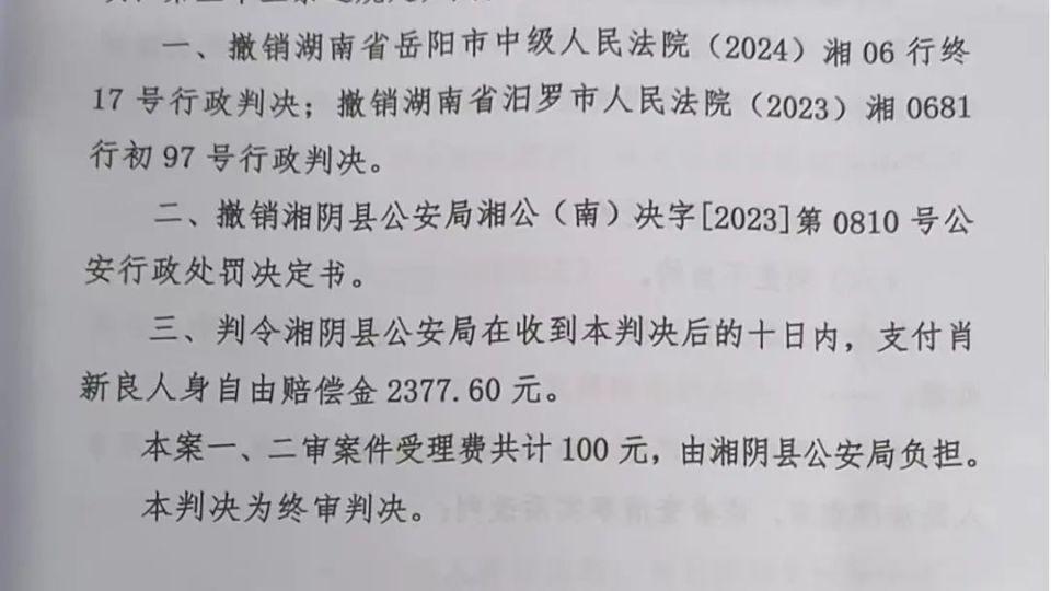 2025 年 6 月 25 日,49 岁的湖南湘阴人肖新良拿到了一份期待已久的判决,这份判决撤销了他曾接受的行政拘留处罚。