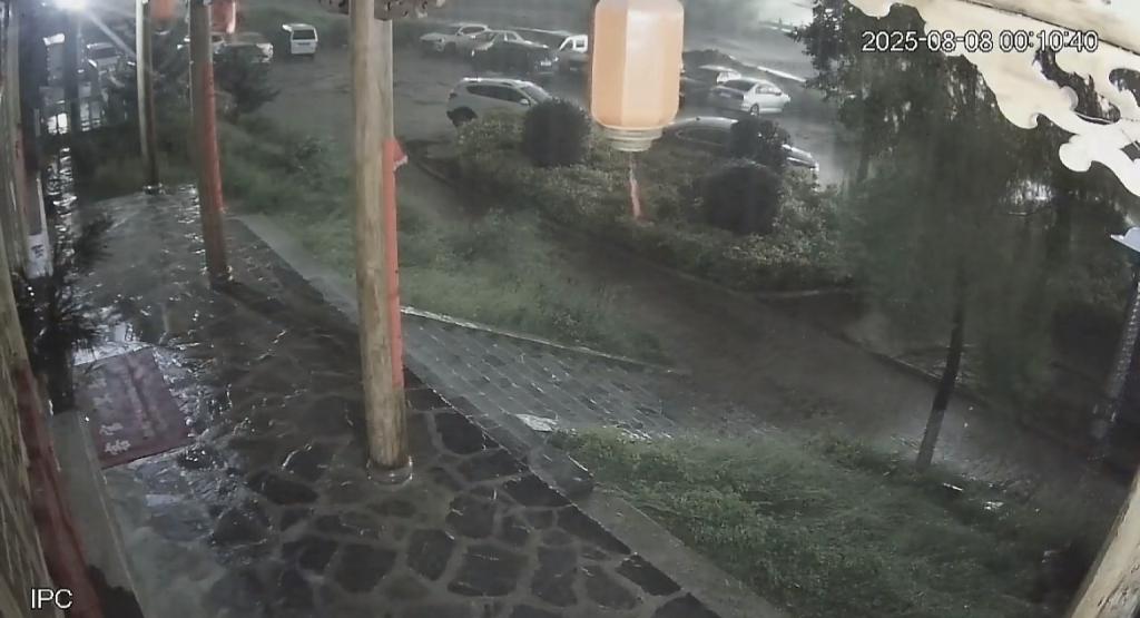上传这段视频的郭先生告诉潇湘晨报记者,从 8 月 7 日晚上就开始下雨,下了一晚上,河道有三四米深,8 月 8 日 0 点以后河水溢出,把小区门口停车场的车子都冲跑了,车子有小区住户的也有附近农家乐客人的车子,好在水只淹到监控中的台阶那里,没有继续上涨漫进小区。听着外面的大雨,小区的住户基本上一夜没睡,第二天查了监控就有了视频中的一幕," 这么大的涨水这里几十年没见过。"